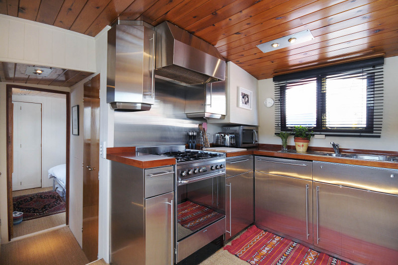 Кухня в лодке выполнена из не ржавеющей стали. Кухня может и простоит много лет, но вот как быть с собственным здоровьем, день и ночь жить в сырости. Человек то сделан не из стали.