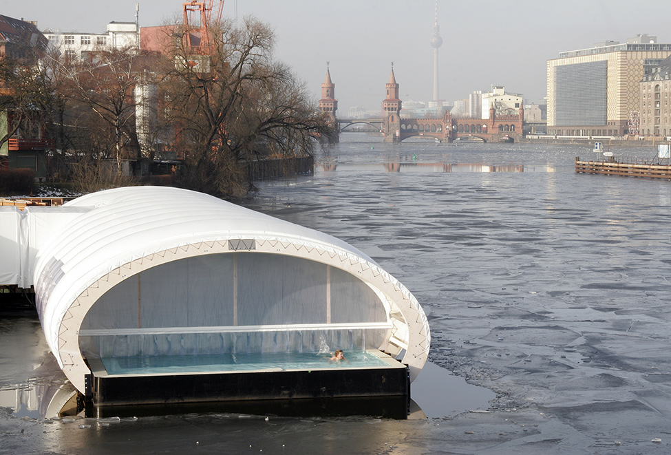 В Берлине на реке Шпрее плавательный бассейн построен в 2004 году. Это целый оздоровительный комплекс площадью 740 кв. метров, включая несколько саун, кафе, площадки для принятия солнечных ванн. Размер бассейна 8 метров на 32 метра, глубина 2 метра. На зиму весь комплекс отдыха, состоящий из трех блоков накрывается крышей, позволяющей сохранять комфортные условия для плавания и отдыха.