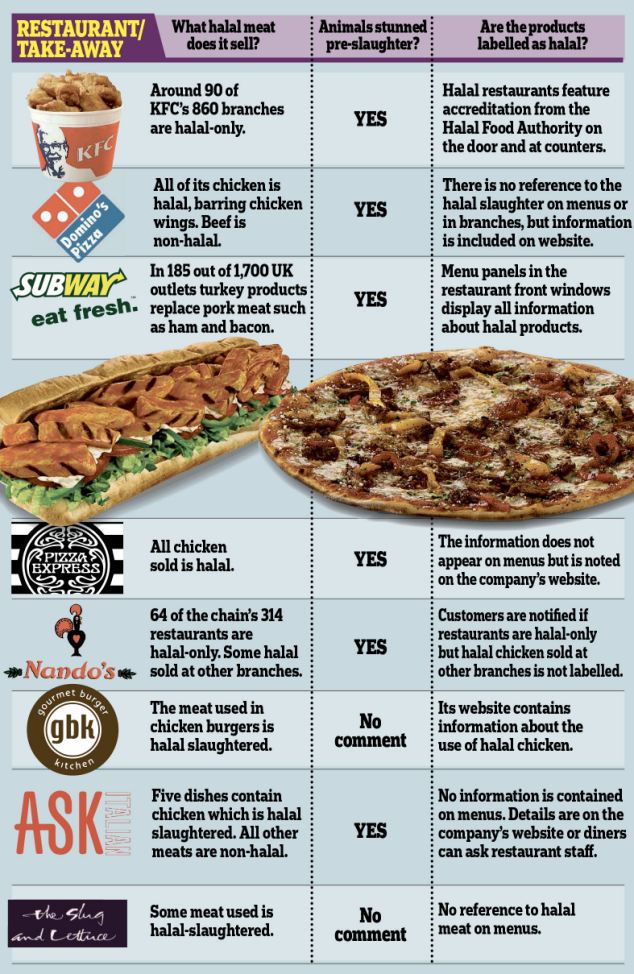 Мы обратились по электронной почте в некоторые популярные рестораны, относительно использования мяса ритуально убитых животных, почти все рестораны отказались обсуждать эту тему. Удалось выяснить, что только Subway and KFC открыто маркируют халяльные мясные продукты в своем меню.