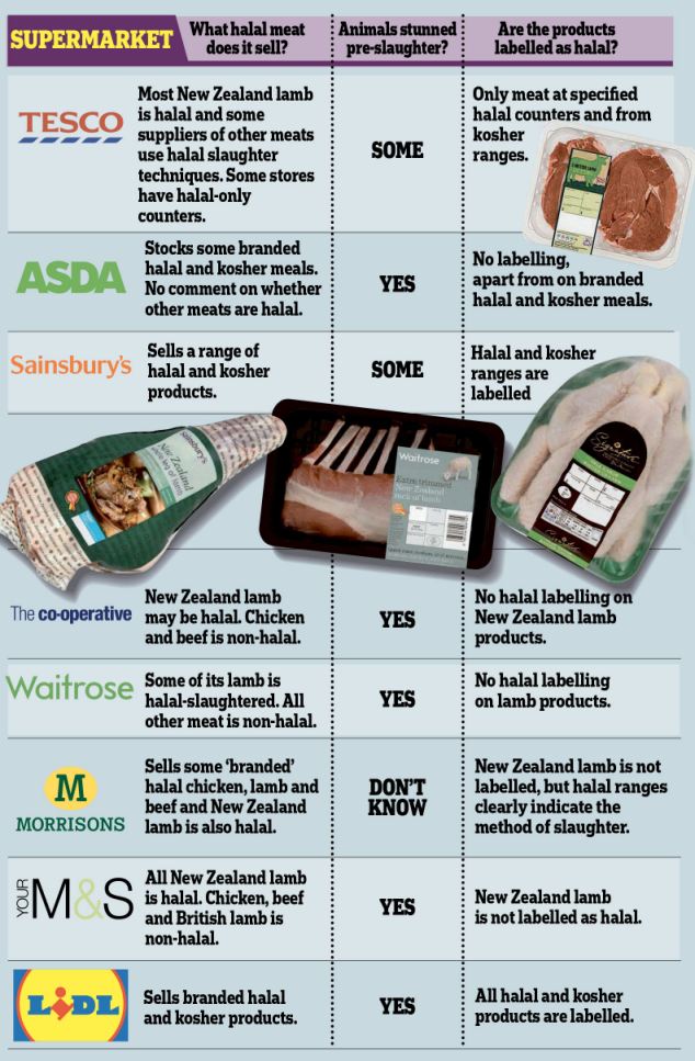 Британские супермаркеты Tesco, Sainsbury `s, Morrisons, Waitrose и М & S продают хаяляльное мясо под видом обычного.