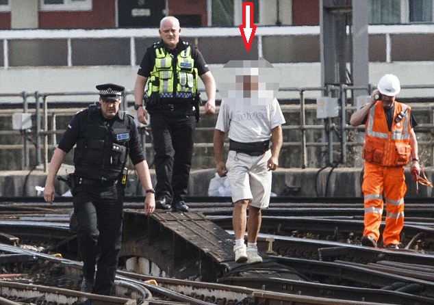 Хаос на станции Ватерлоо в Лондоне случился после того, как человек в белых шортах, белой футболке Adidas и с черной сумкой вокруг пояса отправился пешком по рельсам от платформ 13 и 14.