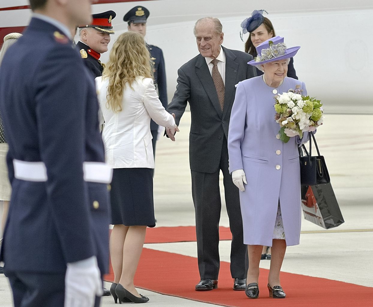 Королева Елизавета II в сопровождении принца Филиппа в военном аэропорту Чампино в Риме.