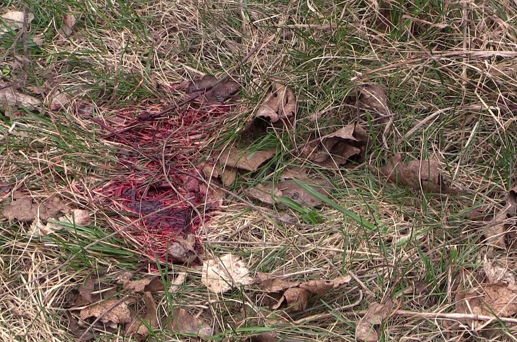 Кровь Сашко на траве на том месте где его настигли бойцы Сокола.