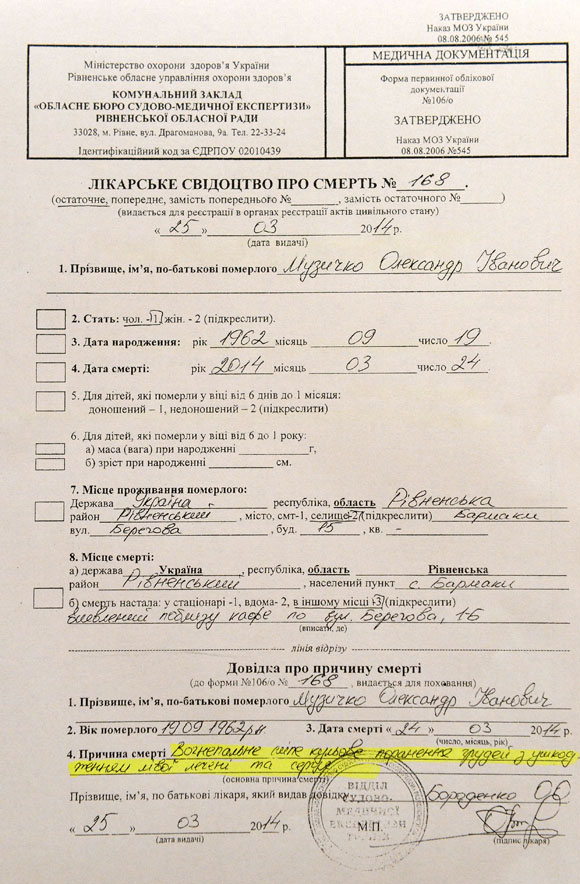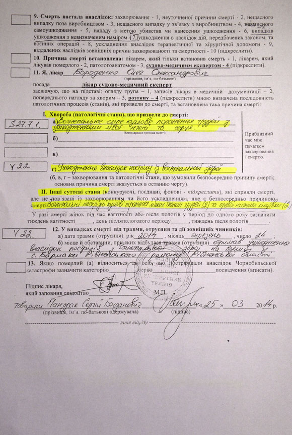 — Я сам военный и много чего в своей жизни видел, поэтому рассказывать мне про то, что Сашко сам застрелился, не надо — иначе следы от пороха на теле были бы другими. Его убили — сначала прострелили ноги, завалили и заковали в наручники, потом разорвали футболку, чтобы убедиться, что на нем нет броника, и выстрелили прямо в сердце, метров с двух, причем из его же пистолета, — Пандрак достает заключение судебно-медицинской экспертизы, где причиной смерти значится огнестрельное ранение в сердце. — Я разговаривал со специалистами — они всё это подтвердили. Я не верю, что Сашко стрелял в кого-то из «Сокола» — у нас есть видео с камер наблюдения, со всех четырех, он бы просто не успел это сделать.