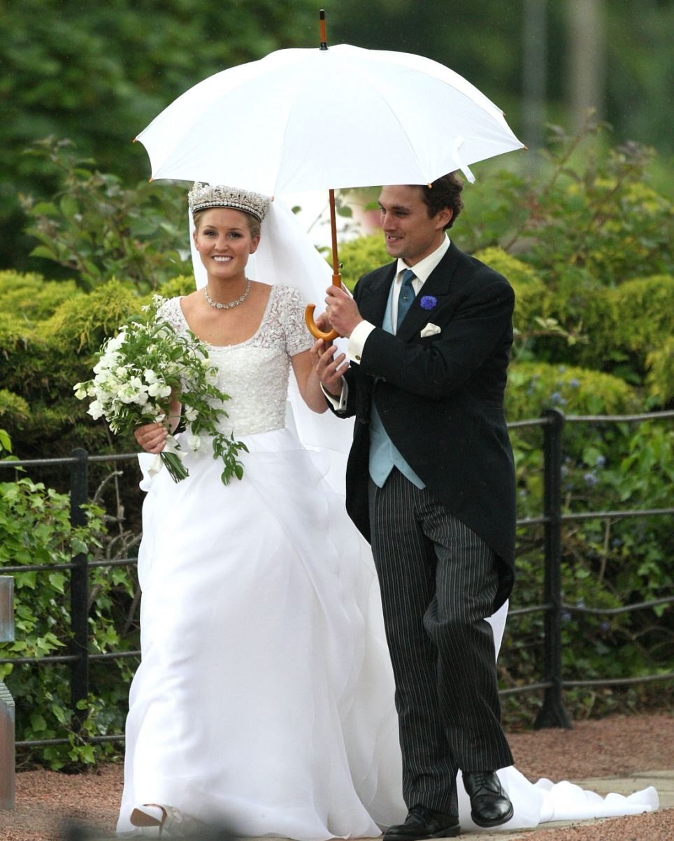 Дождь молодоженам не помеха. Томас Ван Страубензи и леди Мелисса Перси после церемонии в местной церкви Святой Марии. Свадьба продолжается.
