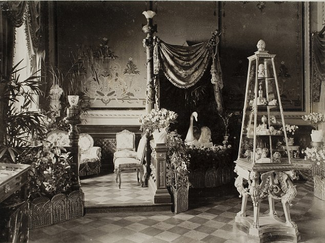 На этой старинной фотографии подаренное императором Александром III императрице Марии Федоровне пасхальное яйцо выставлено в пирамидальной стеклянной витрине в одной из царских палат.