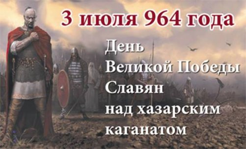 Порой доходит до смешного, они и даже день точный знают когда случилась Великая победа. Расчет простой, гонимые славяне падки в силу своей ментальности на разного рода ура патриотические юбилеи. Ну скажи ты просто, что была еврейская Хазария, даже простофили не поверят, а вот если Великая победа над Хазарией была, тогда вне сомнения было еврейское государство, которое мы победили. Для того и удлинили официальную историю на 1000 лет, чтобы была возможность вписать туда всякую хрень. Для того впаривали нам в школе на уроках истории, то чего никогда не было, для того и академики все евреи.
