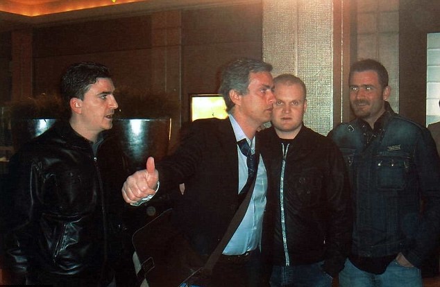 На этой фотографии трое гангстеров вместе с Моуринью в отеле Arts в Барселоне. Английский Челси прилетел в Барселону на матч с испанской Барселоной в рамках турнира Лиги чемпионов.