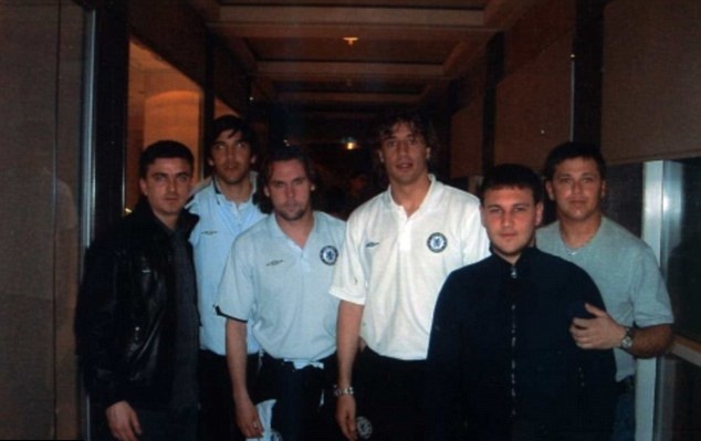На снимке двое итальянских мафиози вместе игроками Челси Hernon Crespo и Nuno Morais после матча с Барселоной в Лондоне. Игра закончилась 1-1.