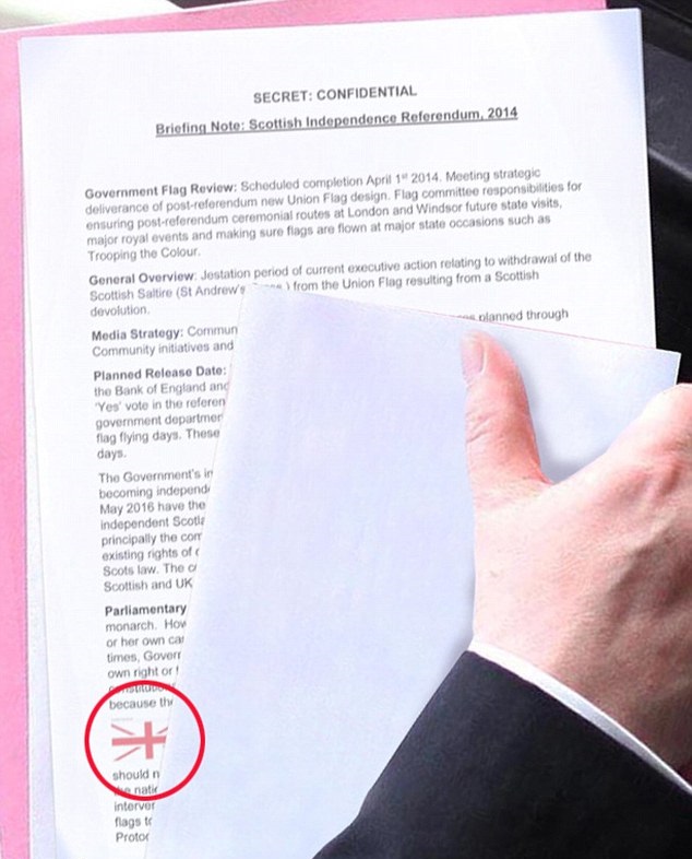 Подробности того как будет выглядеть флаг Шотландии и некоторые интересные секретные детали будущего Шотландии стали достоянием общественности после того как одному из фоторепортеров удалось поймать в объектив фотоаппарата секретный правительственный документ в руках одного из правительственных советников, вышедшего из резиденции премьер министра на Даунинг-стрит 10 в Лондоне.