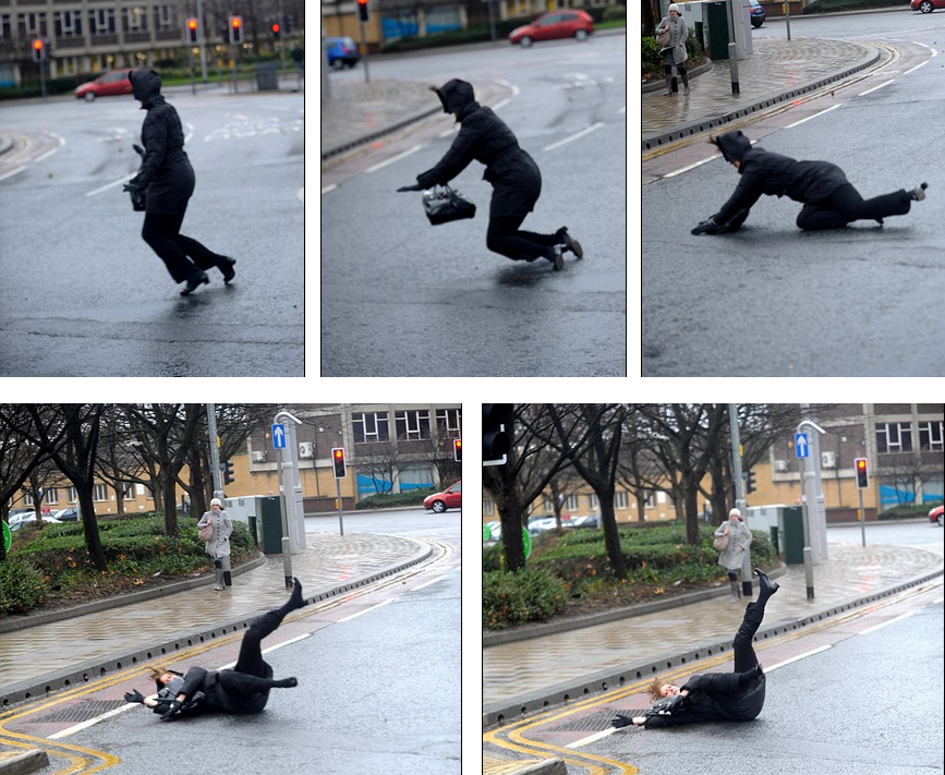 Пешеходов, не успевших во время найти укрытие, ветер сдувал с дороги, так что многим из них ползком и на четвереньках приходилось добираться до ближайшего убежища.