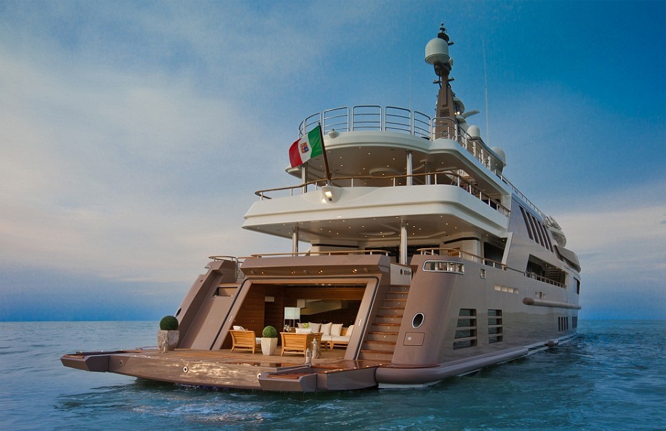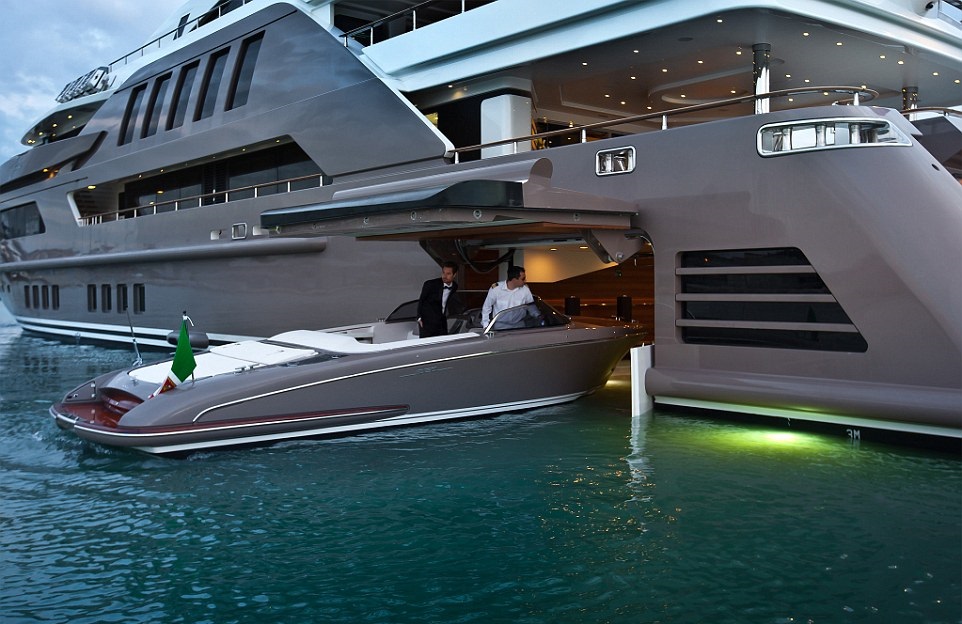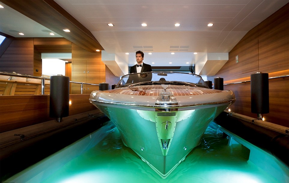 В то время как вертолетные площадки, водные горки, и кинотеатры, давно стали привычным дополнением в яхтах супер богатых, стильное итальянское судно стало первым законодателем новой моды, когда катер вплывает прямо в корпус яхты.