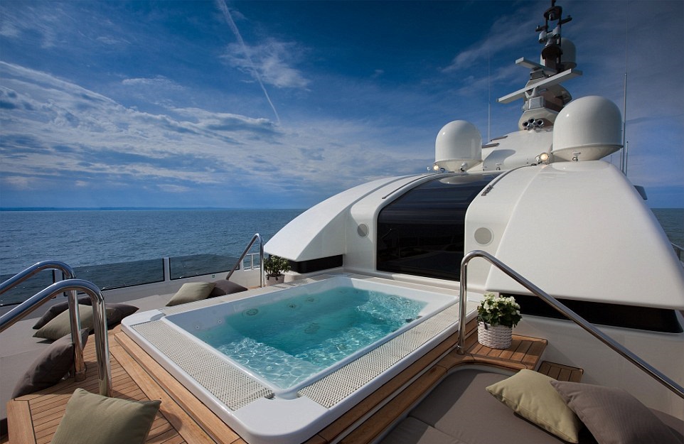 На верхней палубе яхты зона отдыха с открывающимися бескрайними океанскими просторами и бассейн с гидромассажем под открытым небом.