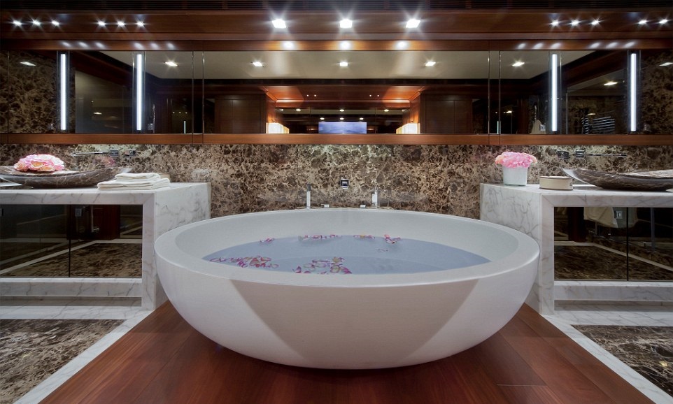 Ванная, высеченная из цельного куска итальянского белого мрамора, облегчает жизнь собственнику яхты в его каюте люкс. Просто мраморная чаша посреди океана, лепестки цветов и ничего лишнего. Ну разве не скромно?