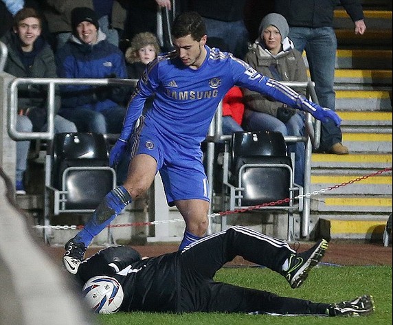Игрок Челси, Eden Hazard, чья зарплата составляет £ 170 000 в неделю, был удален судьей с поля в конце игры против Swansea в рамках турнира Capital One Cup за удар ногой мальчика, подающего мячи.