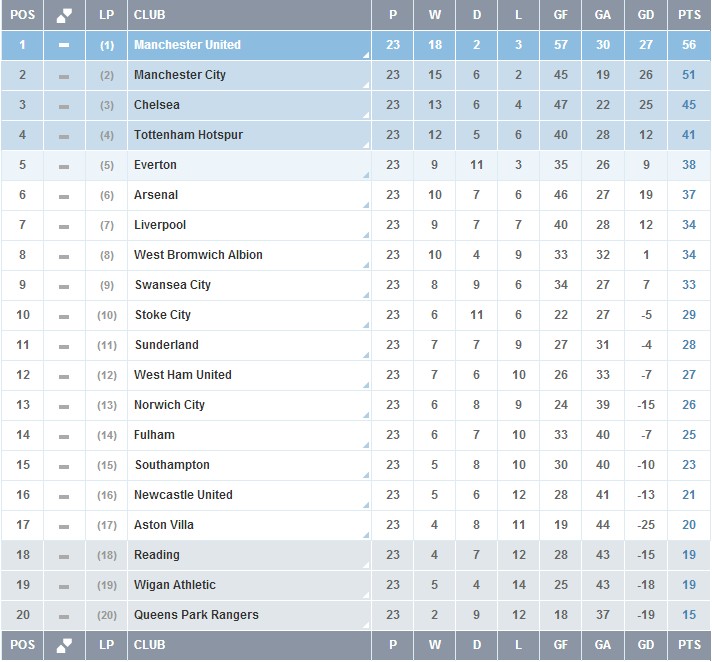 Официальная таблица результатов Английской Премьер Лиги на 24.01.2013
