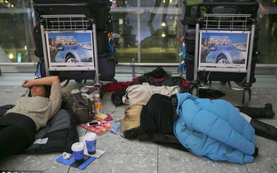Пассажиры в ожидании отложенного рейса в аэропорту Хитроу в 2012 году во время снегопада.
