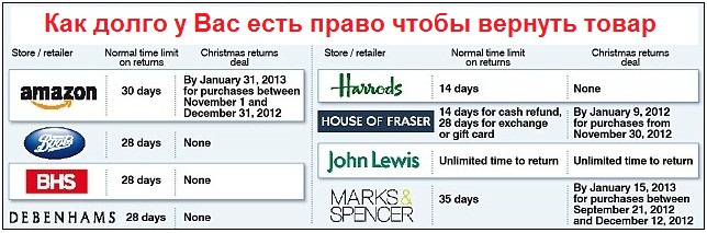 Если вам разонравилась купленная вещь, не откладывайте в долгий ящик ее возвращение в магазин. Большинство магазинов в Великобритании не примет назад покупку, если вы вернете ее слишком поздно. Это правило действует и в отношении возврата не понравившихся рождественских подарков. Наиболее длинные сроки возврата подарков установили компании Marks & Spencer и Amazon, позаботившиеся чтобы покупатели не волновались на счет ограниченного срока возврата.
