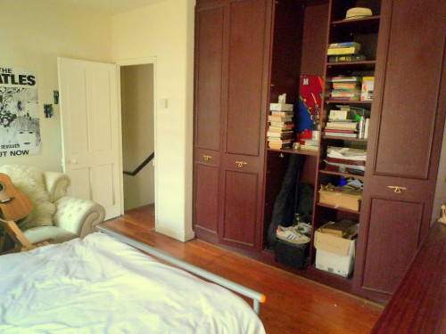 Новая отделка, комната с балконом. В комнате много места, высокие потолки, деревянный пол, хорошая мебель: двухспальная кровать, полки, стол, кресло. Комната тихая, светлая. Много места для хранения вещей, встроенный шкаф.