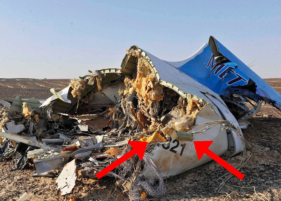 Хвостовая часть самолета Аэробуса А321, вывернутая в одном месте фюзеляжа наружу, может свидетельствовать о взрыве внутри самолета.